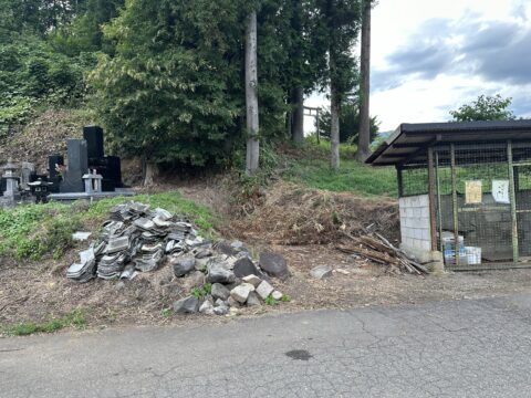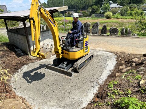 今回の工事は砕石敷均し工事になります。この工事は何しろ安く!!という事なので、色々考えました。ただ石や木材などはそこら辺に捨てるわけには行かないので、処理場へと持って行きました。土を捨てる作業をくぼんでいる箇所があったので、そこへ入れて見た目をよくしました。くぼみへ残土を入れた事により砕石の厚さも確保でき、周辺の見た目も綺麗にすることができました。