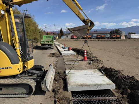 今回の工事は水路蓋設置工事です。この工事は特殊な型枠を作り、年に何回か行っている工事です。子供の通学路に、しっかりと蓋を設置しておらず危ない状況です。しかしいっぺんに工事をやる予算が確保できません。予算がないなら安くやるためにはどうすればいいか考えながら行っています。製品を買うのは簡単ですが、その製品がまた高い!!その製品を買うだけに、1枚7万円!!これは何枚もできる話ではありません。そこで平沢土建株式会社は型枠を作ってもらい、自分たちで蓋を作る取り組みを始めました。すると1枚7万円だったのが35000円も安くでき、また施工費を入れても7万円ほどと、製品を1枚買うだけで、施工ができてしまうというやり方に辿り着きました。安くできればいいや!!ではありませんが、同じ強度で保たれて子供の安全確保ができれば良いでね!!